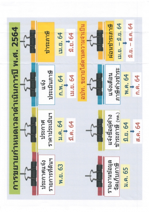 ให้ขยายกำหนดเวลาดำเนินการตามพระราชบัญญัติภาษีที่ดินและสิ่งปลูกสร้าง พ.ศ.2562 เป็นการทั่วไป ออกไปอีก 2 เดือน เฉพาะการจัดเก็บภาษีประจำปี พ.ศ.2564