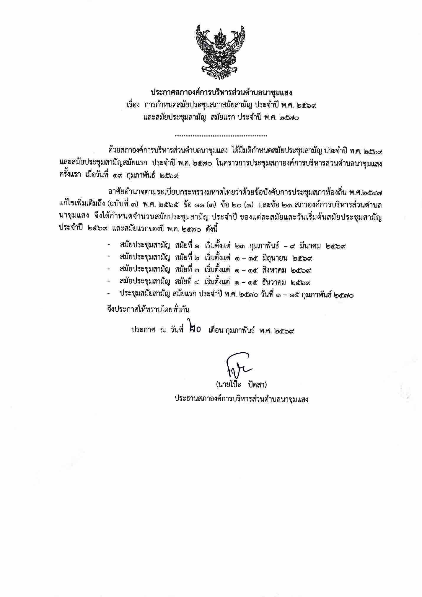 การกำหนดสมัยประชุมสภาสมัยสามัญ ประจำปี พ.ศ 2569 และสมัยประชุมสามัญ สมัยแรก ประจำปี พ.ศ.2570